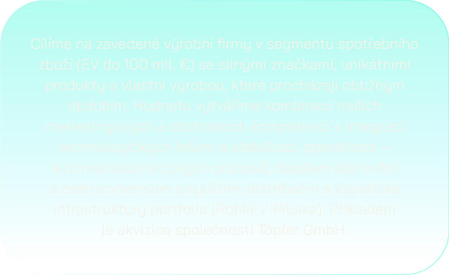 Primárně se soustředíme na CEE a DACH. Vyhledáváme ale i příležitosti v Evropě a Severní Americe, u kterých dokážeme uplatnit naše kompetence a přinést měřitelnou přidanou hodnotu.